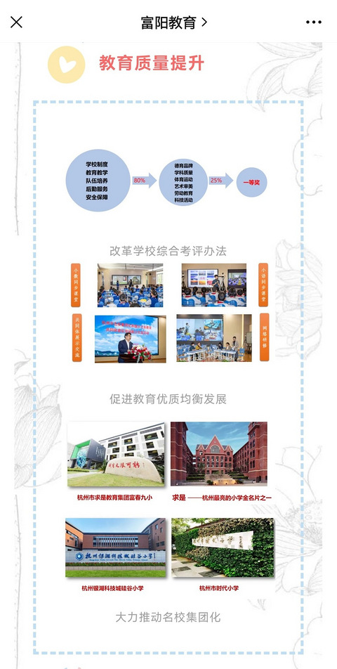 昨天,富阳区教育系统第二十二轮暑期师德培训动员会在富春七小顺利举行。富阳教育官微发布了消息,在教育质量提升一块,将银湖硅谷小学与杭州市时代小学放在了一起。与此对应的是上方的求是富春九小和求是小学。而富春九小与求是的名校合办是官宣过的,这不免让人有了想象:或许,这就是银湖硅谷小学与杭州时代小学的低调官宣?让我们一起等待官宣吧。