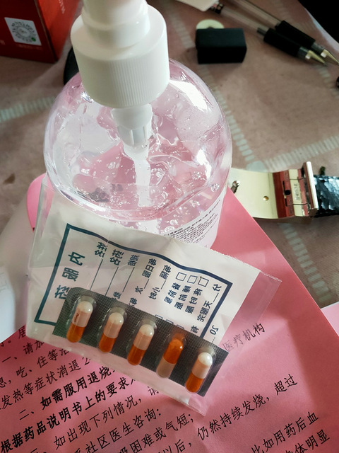 今天中午时分,终于领到了药。可是,貌似严重缩水,,,一瓶消毒液 加一小包退烧药,一张防疫指南