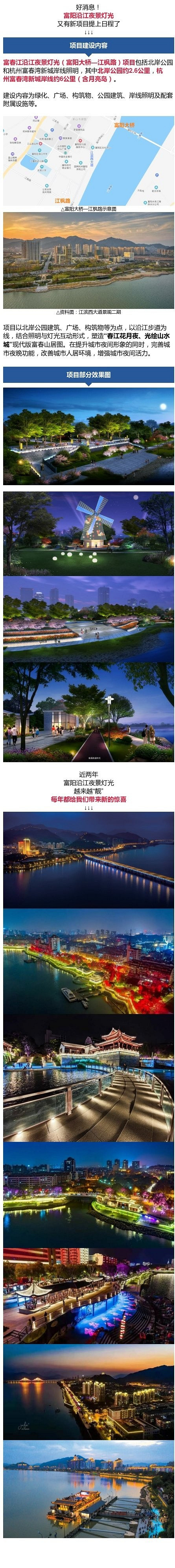 【超8公里!富阳的滨江岸线又将有新变化!】好消息!富阳沿江夜景灯光又有新项目提上日程了~富春江沿江夜景灯光(富阳大桥—江枫路)项目包括北岸公园和杭州富春湾新城岸线照明,其中北岸公园约2.6公里,杭州富春湾新城岸线约6公里(含月亮岛)。建设内容为绿化、广场、构筑物、公园建筑、岸线照明及配套附属设施等。项目以北岸公园建筑、广场、构筑物等为点,以沿江步道为线,结合照明与灯光互动形式,塑造“春江花月夜、光