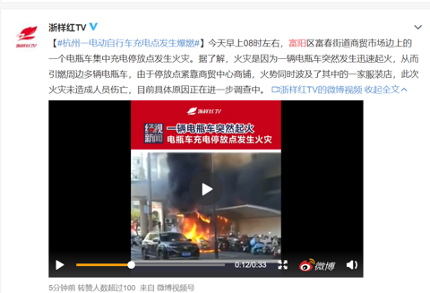 今天早上08时左右,富阳区富春街道商贸市场边上的一个电瓶车集中充电停放点发生火灾。据了解,火灾是因为一辆电瓶车突然发生迅速起火,从而引燃周边多辆电瓶车,由于停放点紧靠商贸中心商铺,火势同时波及了其中的一家服装店,此次火灾未造成人员伤亡,目前具体原因正在进一步调查中。 来源:微博、富阳19楼网友爆料