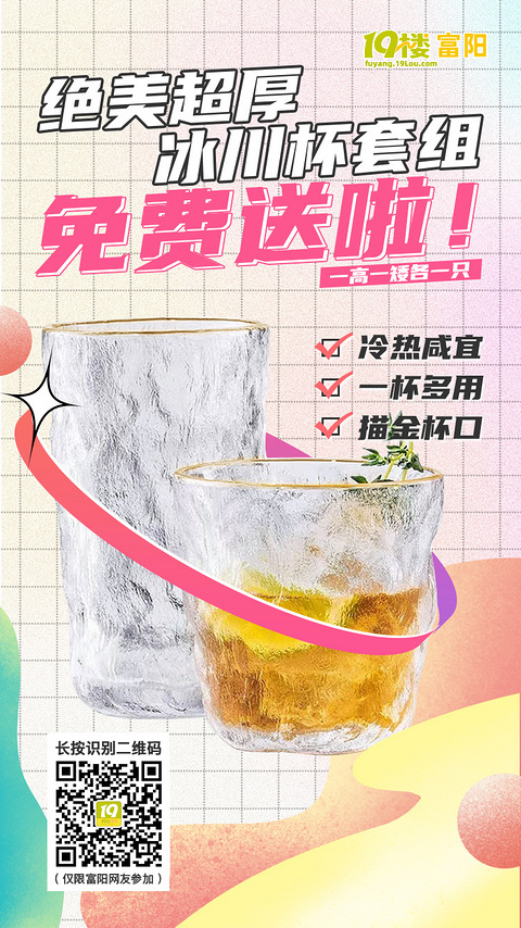 当当当当!!!宠粉福利准时上线啦这次给大家准备了超美的冰川杯具体有多美??拿到手你就知道了反正小编已经提前自留了一份【冰川杯】 金边杯口的款式哦~玻璃很厚实,不易烫手有纹路也有质感,不用担心打滑泡点柠檬,喝点果汁那和一般的杯子档次就是不一样赏心悦目呢 这次还是一样哈免费送给大家一套哦一高一矮各一个!数量有限哟!【参与方式】进入富阳19楼微信公众号(或直接扫描上方二维码)——击菜单栏里的“冰川杯”即