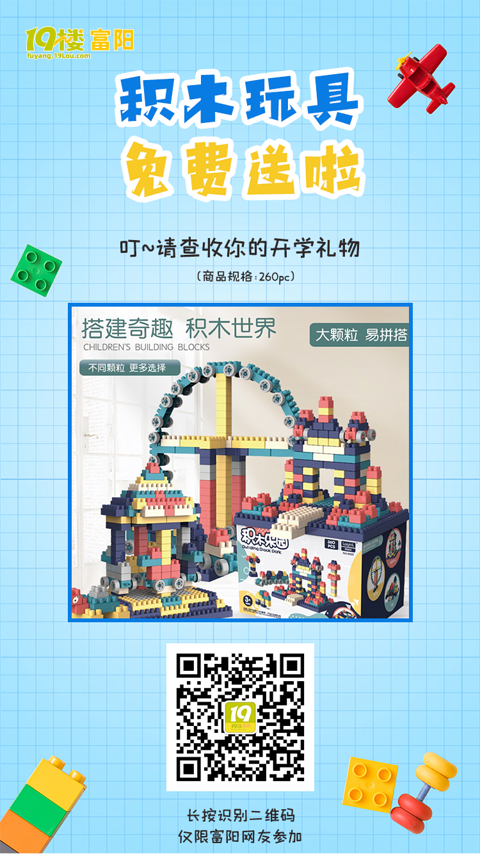启蒙是人生的一个重要开端在孩子的启蒙路上我们能给TA带来什么?当然是陪伴他们一起“玩”一起探索积木的世界让孩子肆意挥洒他们天马行空的想象力【积木玩具】 每个家庭必不可少的益智启蒙玩具哟转角采用圆滑处理平滑不伤手来这里免费领取一份积木玩具让孩子大胆去探索去动手思考去创作更多不一样【参与方式】进入富阳19楼微信公众号(或直接扫描上方二维码)——击菜单栏里的“积木玩具”即可参与活动!【查看进度】:回复“