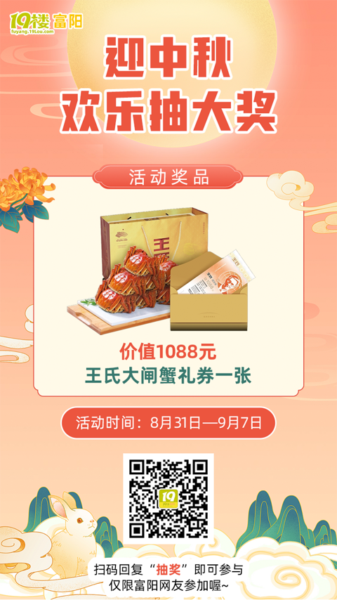 期盼已久的中秋假期就要到啦想想就很激动,美滋滋~这猝不及防的放假节奏叠加今天的幸运抽奖瞬间让快乐翻倍 【活动奖品】价值1088元的王氏大闸蟹礼券 【参与方式】进入富阳19楼微信公众号(或直接扫描上方二维码)——回复“抽奖”即可参加活动。【活动时间】2021年8月31日—2021年9月7日【活动须知】1.本次活动仅限富阳本地网友参与。2.活动最终解释权归富阳19楼所有。有任何活动疑问添加富阳19楼微
