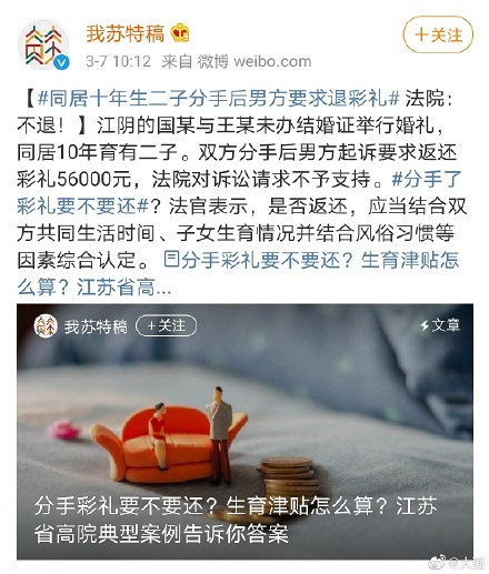 今天微博看见一个话题:分手了彩礼要不要还?(具体如下图) 看话题还以为是给了彩礼在结婚之前分手的呢,结果点开一看不是那么回事 话说这个没领证但办了婚礼的,而且举办婚礼时间在2009年,同居了十年还有了孩子,怎么说也是事实婚姻了吧,这种情况肯定不还的啊, 大家是不是和我想的一样,不还?