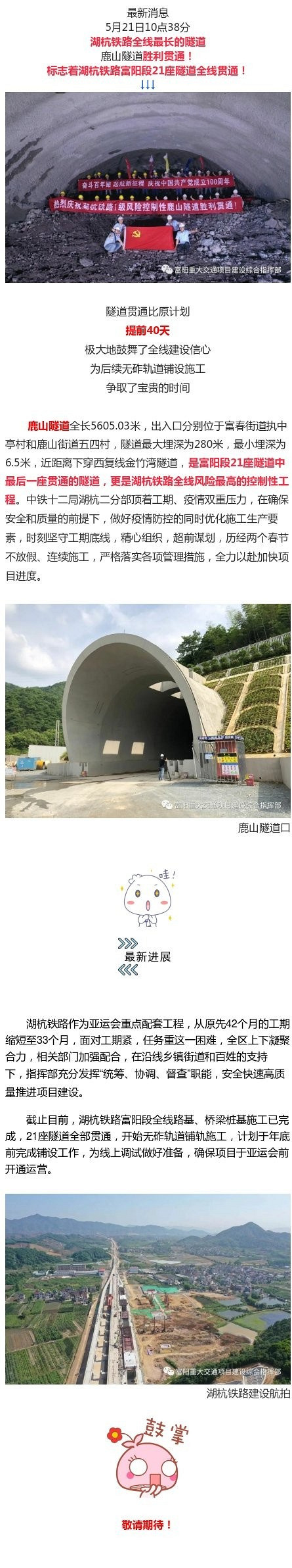 好消息!湖杭铁路富阳段21座隧道全线贯通!
