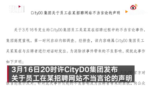 世界之大,无奇不有,找个工作还要被说“智商有问题”真的是:伤害性不大,侮辱性极强极强啊!!! 近日,线上招聘平台,一求职者想投递杭州某大数据公司的产品运营岗位时,公司HR询问其大学学历,并表示他们只招收二本以上的统招,并称:“考不上本科的都是智商有问题” 虽然3月16日该公司回应:此事系员工个人不当言论,已批评教育。不代表任何CityD0官方态度,官方对该言论表示反对。但总感觉是统一的官方回应,有