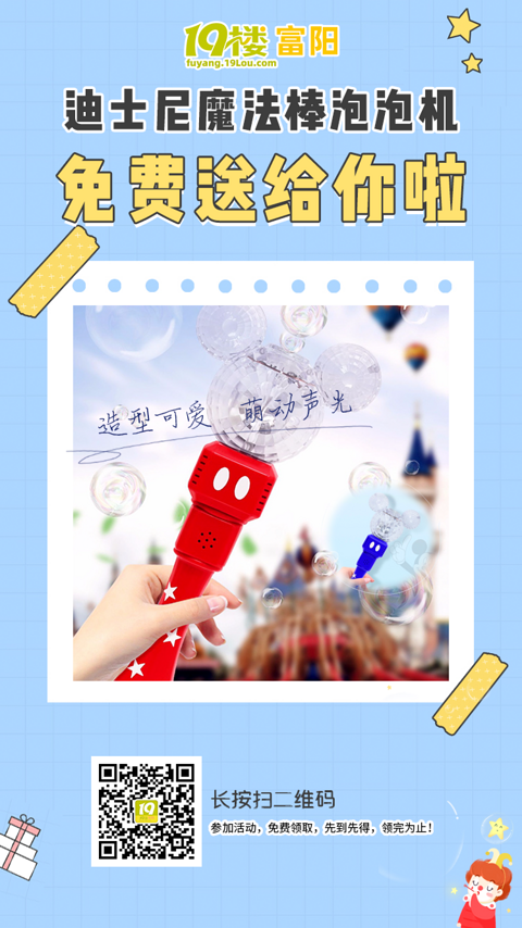 富阳19楼宠粉活动又又又来啦!这次是什么呢?迪士尼魔法棒泡泡机小编使用之前:不就是一个泡泡机?多大人了还玩这个?上手之后:啪啪打脸!既能凹造型、搞气氛,还能和孩子一起玩,消磨熊孩子的时间,恩,是真的香! 不仅有迪士尼经典米奇卡通形象还有炫酷灯光音! 被美丽的泡泡机围着一切烦恼都能抛到脑后,谁还不是一枚小公举呢?快给自己或者是家里的小宝贝来一个吧!先到先得,领完为止!免费邮寄到家哦! 【参与方式】进