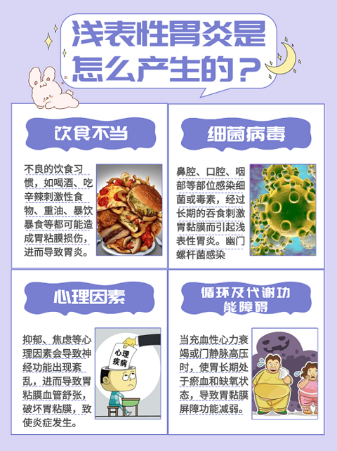 胃病走过弯路的人相信一定不少,对症治疗才能事半功倍,今天就来说说慢性浅表性胃炎的调理方法大全~纯干货~…一、浅表性胃炎产生的原因?1、不良的饮食习惯2、鼻腔、口腔、咽部等部位感染细菌或毒素3、抑郁、焦虑等心理因素4、循环及代谢功能障碍 二、浅表性胃炎如何调理?1、饮食宜软2、饮食宜少3、饮食宜缓4、饮食宜淡 幽门螺旋杆菌被明确认为是引起消化性溃疡、慢性胃炎、消化不良等常见病的致病因子,所以更应该得