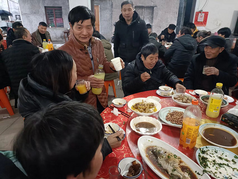 [杀年猪 吃杀猪饭] 村民倪忠德、骆红云夫妇2024年养了三头猪,为答谢邻里关心照顾,特地办了一席杀猪饭,整整十桌。被邀宾客除邻里外,有亲戚好友、骆红云的同学等,倪忠德高兴地说,他从常安镇安禾村来觃口定居后,一直受到邻里的关顾,受到村支两委的器重。在清洁城乡的岗位上,倪忠德认真负责的精神受村民的一致好评。饭桌上,一向不善言辞的他,频频用饮料代酒向来客表达敬意。他说,大家能如约参加,感到十分开心。
