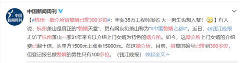 随着《赘婿》火出圈,“上门女婿”一时成为人人津津乐道的话题。从“富家女盼上门女婿”到“拆迁女苦寻入赘男”有文章说,杭州萧山是真正的“赘婿天堂”,“中国赘婿哪家强,浙江杭州找萧山”的顺口溜在网上流传,更有网友将萧山定义为“中国赘婿之都”。就连年薪35万的工程师也来凑热闹! 萧山入赘这么流行,在好奇心的驱使下,突然想知道我们富阳入赘的情况,所以我去论坛拔了一下,还真找到了一些征婚入赘的信息,板凳拿出
