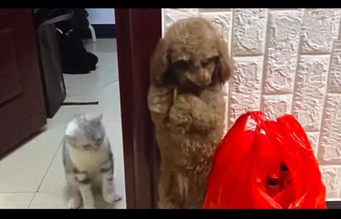 有这么一位网友,家里养了只猫咪和一只泰迪,两个小家伙相处的倒是挺好的,不过后来证明是塑料姐妹情。这一天泰迪因为做错事了,被主人罚站在门口。狗狗就乖乖的站在那里,还不停的作揖求主人原谅。而猫咪在看见泰迪的样子后,竟也站起来模仿它的动作,这是在嘲笑泰迪吗? 虽然猫咪并没有对泰迪做什么,但是它做这系列的动作,明显就是想取笑泰迪呀!虽然攻击性不大,但是侮辱性极强!猫咪:喂兄弟,看我学你像不像呀?你就是这样