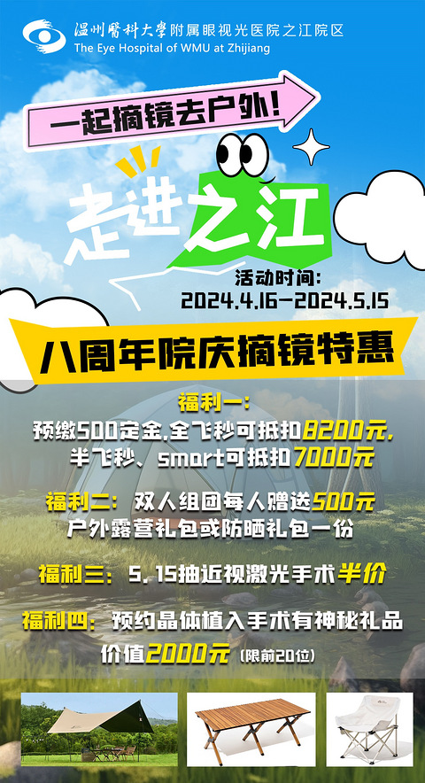 五一劳动节,浙江省眼科医院之江院区院庆!院庆来啦!超值活动来喽!活动时间:4.15-5.15活动内容:预交500及可参与优惠全飞秒最高优惠8200半飞秒/smart全激光优惠7000晶体手术优惠:术后可送晶体植入摘镜礼包,价值2000元手术抽半价:5.15抽近视手术半价,限激光哦组团享好礼:双人组团每人赠送500元户外露营或防晒礼包一份