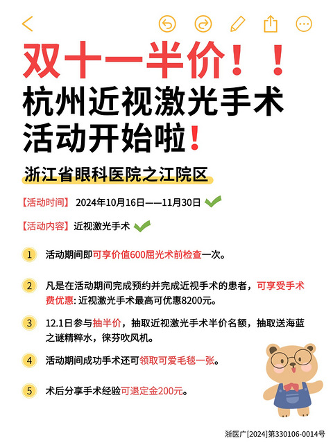 【活动时间】 2024年10月16日——11月30日【激光手术优惠】 预缴200定金享优惠[1]全飞秒手术可抵8200,优惠后16800;半飞秒、smart手术可抵7000,优惠后14800起。[2]12.1日抽半价,抽奖名单截止11.30日,抽取近视激光手术半价名额,抽取送海蓝之谜精粹水150ml,送徕芬吹风机。[3]活动期间成功手术患者送毛毯一张。【注意事项】术后小红书分享院内活动及术后感想并