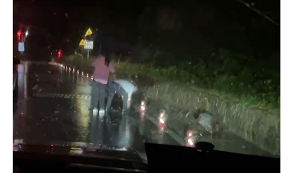 2024年4月29日晚上,杭州红十字狼群应急救援队队员李杭平,五一假期与朋友和家人(两户人家5个人),赴长沙旅游,途径江西望仙谷回程路上,发现前面有一块很大的石头,估计是因当天暴雨导致山坡上滚落下来的。 车子已经开过头了,李杭平还是把车子掉头,靠边停下来,车子打开双向灯后才下车。然后把这块100多斤的大石头,使劲地移到公路旁边。把大石头移到路边后,他又把周围的锋利