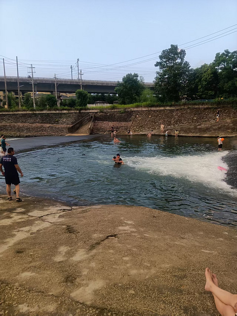 雷阵雨天气,相对于高温还算是比较凉爽的。双休日,湖源溪前来玩水的人依然是络绎不绝。 2025年7月27日,杭州红十字狼群应急救援队的10多名队员依旧在湖源溪做安全保障。鲍国庆、占梁等3名队友,负责同心坝这个区块的保障。他们时刻密切关注湖源溪上的动态,由于昨晚下过大雨,水流也很大。 上午10点20分左右,一名年轻的妇女,自划一艘气垫船,随着水流,不由自主地向下游漂荡,呼救声也随