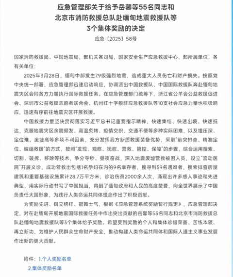 为奖励先进、树立榜样、鼓舞士气,根据《应急管理系统奖励暂行规定》,2025年7月11日,应急管理部发文,对在赴缅甸开展地震国际救援任务中作出突出贡献的55名同志和3个集体给予奖励。 本次集体奖励的记二等功2个(北京市消防救援总队赴缅甸地震救援队、浙江省公羊会公益救援促进会赴缅甸地震救援队),三等功1个(中国地震应急搜救中心赴缅甸地震救援队);个人奖励记二等功2人、三等功7人,嘉奖