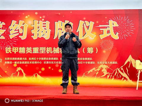 铁甲精英救援队,应急力量再升级。 2025年3月12日,东阳市铁甲精英重型机械救援队(筹)签约揭牌仪式在东阳举行。杭州红十字狼群应急救援队作为共建单位之一,也参加了本次活动。 仪式现场,醒目的红色背景板上“签约揭牌仪式”几个大字熠熠生辉,共建单位罗列其上,彰显着多方力量的汇聚与支持。狼群救援队大队长陈剑明作为代表站在台上发言,他的神情坚定,传递出对救援事业的热忱与决心。