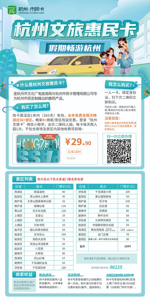 [/11爱心][/11爱心]杭州文旅卡使用365天仅需29.9元,是团建踏青的好选择,单位购买可团购开票。扫图二中的码下单解锁更多优惠欢迎咨询! 打卡杭州热门文旅景点。强烈推荐:西溪湿地、青山湖、黄龙洞夜游、桐庐瑶琳仙境等热门景点。