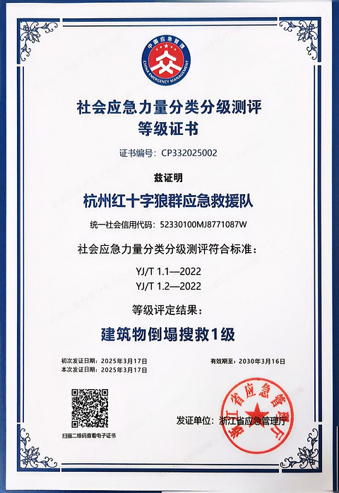 日前,浙江省应急管理厅发布我省首批《社会应急力量分类分级测评登记证书》,根据应急管理部《社会应急力量分类分级测评实施办法(试行)》(应急〔2024〕83号)、《社会应急力量分类分级测评试点工作通知》(应急厅函〔2024〕350号)等相关文件要求,经公共科目和专业科目测评,评定杭州红十字狼群应急救援队为建筑物倒塌搜救1级队伍,德清县红十字山鹰救援队为山地搜救2级队伍,宁波市镇海区红十字海