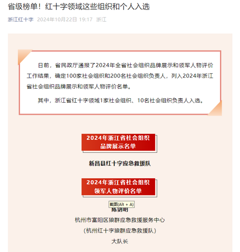 近日,浙江省民政厅公布了2024年浙江省社会组织品牌展示和领军人物评价名单。其中,浙江省社会组织总会及33家会员单位入选社会组织品牌展示名单,27名会员单位负责人入选领军人物评价名单。杭州红十字狼群应急救援队(杭州市富阳区狼群应急救援服务中心)大队长陈剑明被入选为领军人物。 陈剑明,中共DY,杭州市富阳区狼群应急救援服务中心党支部书记、大队长。 他是应急救援工程师、应