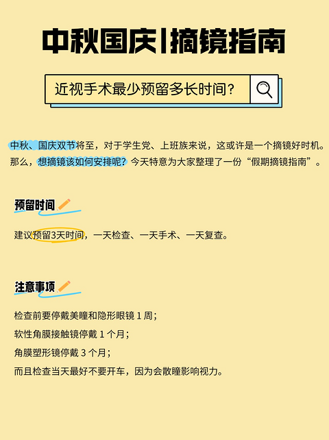中秋、国庆双节将至,对于学生党、上班族来说,这或许是一个摘镜好时机。那么,想摘镜该如何安排呢?今天特意为大家整理了一份“假期摘镜指南”。建议预留3天时间:一天检查、一天手术、一天复查。需注意的是,检查前要停戴美瞳和隐形眼镜1周,软性角膜接触镜停戴1个月,角膜塑形镜停戴3个月。而且检查当天不要开车或骑车,因为会散瞳影响视力。一、术前检查(2小时左右)术前检查是判断是否可以进行近视手术的关键,只有各项