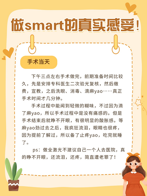 今年年初在杭州做的smart全激光近视手术,已经两个多月了。给大家分享一下当时是怎么选的医院、医生和术后以及手术的真实感受,仅做分享哦~医院怎么选按照我的经验,选本市或者本省的专科眼科医院会更好一些,相较于综合性医院,哪怕是那些三甲综合性医院,在资源投入上大都没有专科眼科医院多。而且专科眼科医院眼科分科会更细致,检查设备、手术室配置也会更齐全、更先进。就杭州来说,我选的是之江眼科,一方面是因为他是