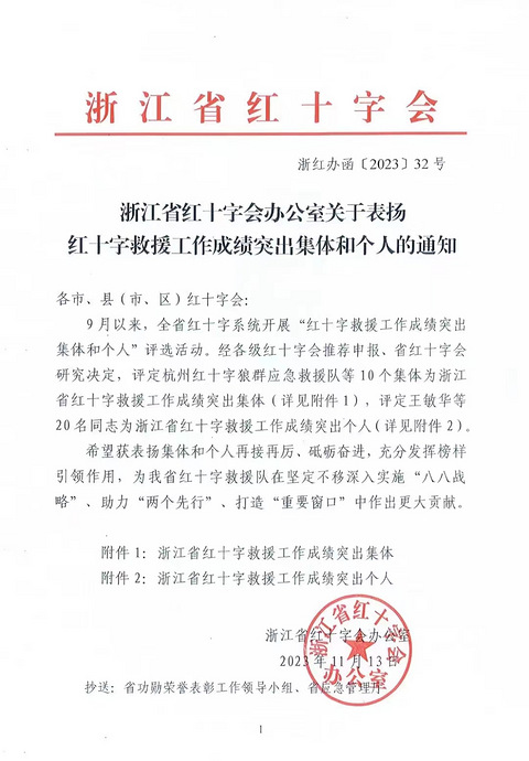 狼群救援队荣获浙江省“红十字救援工作成绩突出集体”称号