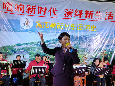 2023年11月17日傍晚,富阳区大源镇大源村的文化广场灯火通明,歌声悠扬,一场主题为“唱响新时代 演绎新生活”的文艺晚会在此举行。 为了丰富百姓的业余文化生活,大源村特此邀请了富阳新关民乐团前来演出。6时整,在梅花锣鼓《社会主义好》《八月桂花遍地开》中拉开帷幕。 整台文艺晚会节目丰富,有男生独唱《红星照我去战斗》,女生独唱《我的祖国》《北京的金山上》《翻身农奴把歌唱》,男女生