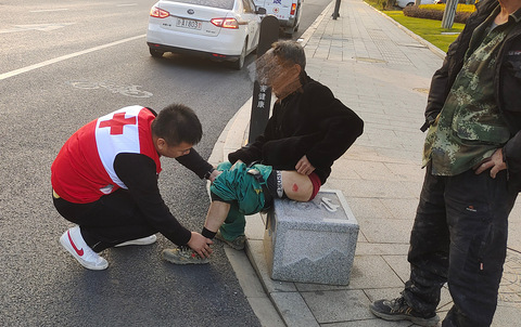 2023年11月28日下午,杭州红十字富阳狼群应急救援队队员孙增程和徐锃杰在外出途中,经过富阳区北环路与恩波大道交叉口时,现场发生一起交通事故,两人立马停车上前了解情况。 原来是一辆电瓶车和小汽车发生碰撞,电瓶车车主大爷有受伤,通过检查判断无骨折,有明显外伤,皮肤挫伤出血,孙增程立马向老人表明自己是红十字救护员的身份。经过大爷同意,对其进行简单包扎处理,并安慰大爷,随后确认大
