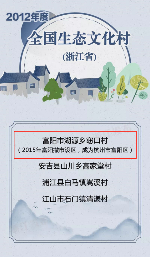 近日,中国生态文化协会发文宣传推广全国128个生态文化村先进建设经验,截至目前,浙江已有50个“全国生态文化村”,数量位居全国第一。其中富阳湖源乡窈口村、新登镇湘溪村位列其中 湖源乡窈口村 窈口村位于富阳最南端,与诸暨、浦江、桐庐为邻,距富阳区中心39公里。自开办窈口农家乐以来,窈口村坚持“走山水路、打绿色牌、建宜居村”的经营理念,结合本地山水文化、红色文化、古建筑文化、宗祠文化、群众文化、