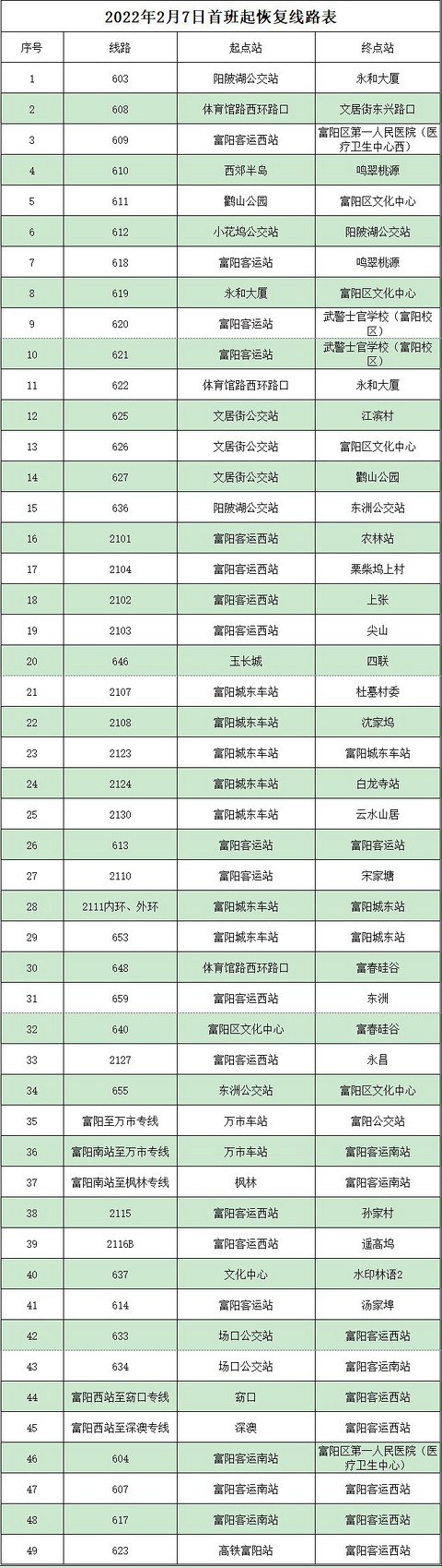 通 告 结合封控解除的实际情况,为方便广大市民出行,根据行业管理部门的要求,富阳公交将逐步恢复线路营运,具体如下: 一、2022年2月6日16:00起恢复12条进杭线路的运营,具体线路见下表: 二、2022年2月6日16:30起恢复13条线路的运营,具体线路见下表: 三、2022年2月7日首班起恢复49条线路的运营,具体线路见下表: 2月7日起除班线、村村通、数字游线、区内夜间线外其余线路