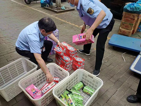 “人小鬼大”骷髅脆皮珠“活该酸到你”果味砂质糖这类容易给孩子误导的儿童食品近日在富阳市场被发现 ↓↓↓ △被查获的无底线营销儿童食品 日前,区市场监管局执法队结合“铁拳”“亮剑”行动部署,联合公安富阳分局环食药大队开展无底线营销儿童食品整治,查获涉嫌无底线营销的儿童食品375盒(袋),对两名当事人立案调查。 6月9日,区市场监管与公安出动执法人员18人,对城区站南弄沿街的批发商店进行检查。 检查中
