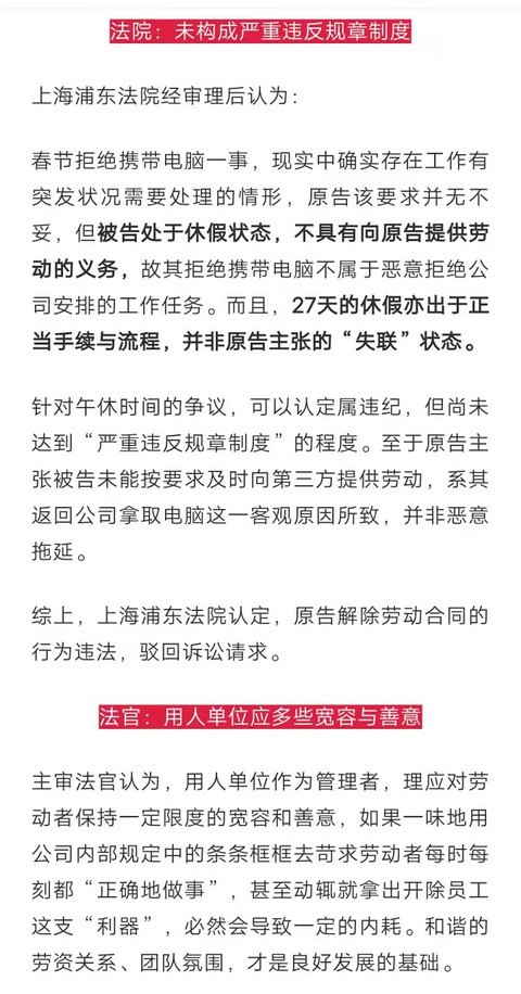 男子因春节拒带电脑回家工作被开除,法院这样判!