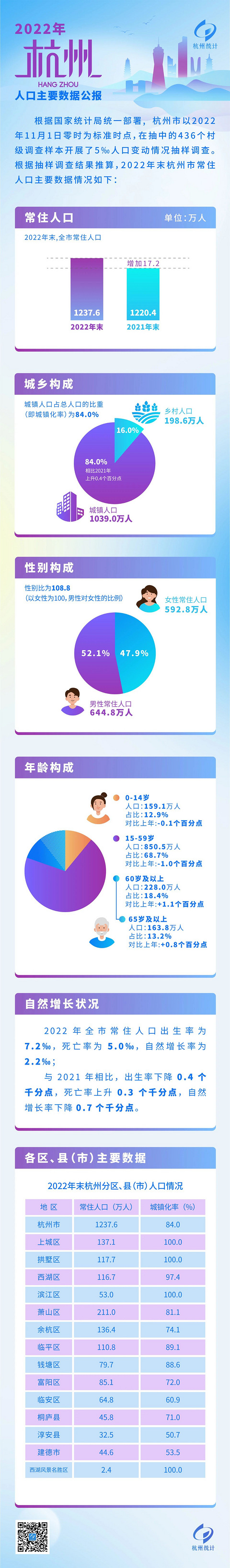 最新消息!杭州市统计局公布2022年杭州市人口主要数据2022年末全市常住人口1237.6万人其中富阳区常住人口85.1万城镇化率72.0% 具体数据如下↓↓↓ 来源 杭州市统计局、杭州发布编辑 胡红吉求点赞+点亮“在看”