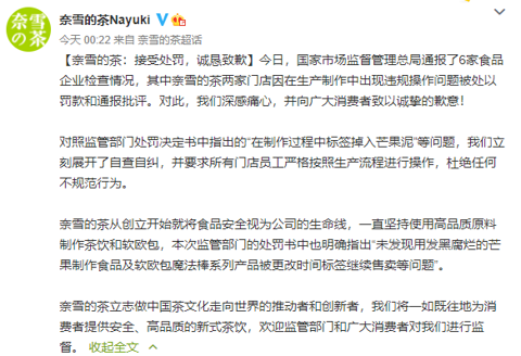 8月24日凌晨,@奈雪的茶Nayuki 发文称“接受处罚,诚恳致歉“。23日,国家市场监督管理总局通报了6家食品企业检查情况,其中奈雪的茶两家门店因在生产制作中出现违规操作问题被处以罚款和通报批评。 奈雪的茶凌晨发文诚恳致歉 据@奈雪的茶Nayuki 官方消息,@奈雪的茶Nayuki 就“在制作过程中标签掉入芒果泥”等问题作出回应。 国家市场监督管理总局通报了6家食品企业检查情况,其中奈雪的茶两家