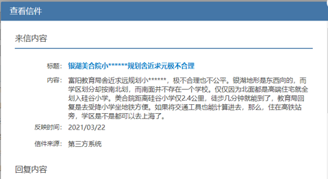 一、关于富阳教育局发布的小学学区规划征求意见的反对意见 信件:近期看到富阳教育局的小学学区规划征求意见稿,我反对将美和院小区住宅划分到受降小学。国家层面要求是学校就近入学的原则,而此次的规划征求意见中,没有将美和院的小学学区规划到就近的银湖小学,反而却是规划到较远的受降小学,这个规划完全不符合就近入学的原则。 回复:你好,经本局调查核实,现答复如下:调查核实情况:依据《浙江省教育厅关于进一步规范义
