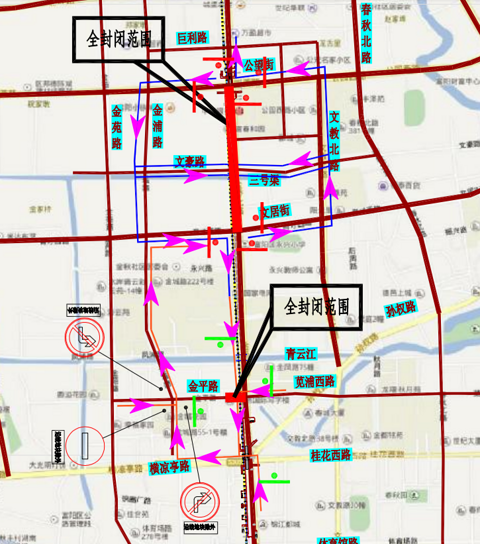 关于金桥北路(公望街-文居街)路段、金平路口实行封闭施工绕行期间交通组织措施的通告 因金桥北路、金桥南路综合提升工程的施工需要, 自2021年8月25日至2021年9月30日期间,金桥北路(公望街-文居街)路段、金平路口实行封闭施工。1、公望街至文居街全封闭施工后,南北向交通由金苑路、金浦路、文教北路、春秋北路、恩波大道进行绕行,其中文豪路东西向保通,横穿金桥北路。 2、金平路路口全封闭施工后,金