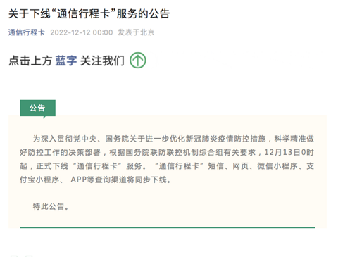 今天(12月12日)0时0分,“通信行程卡”官方微信发布《关于下线“通信行程卡”服务的公告》。 以下为公告全文: 为深入贯彻党中央、国务院关于进一步优化新冠肺炎疫情防控措施,科学精准做好防控工作的决策部署,根据国务院联防联控机制综合组有关要求,12月13日0时起,正式下线“通信行程卡”服务。“通信行程卡”短信、网页、微信小程序、支付宝小程序、 APP等查询渠道将同步下线。 多地开展“全民戴口罩”行