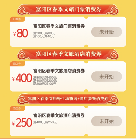 富阳区文广旅体局将通过美团派发“宋福富春年”百万文旅消费券半价住宿力度空前吃喝玩乐尽享优惠1月16日开抢数量有限,先到先得! 消费券类型 消费券分为住宿消费券和景区消费券。 ◎住宿消费券有3种面额:满800元减400元、满400元减200元、满200元减100元。富阳区内部分酒店、精品民宿可用。 ◎景区消费券有2种面额:满200元减80元、满100减40元。富阳区内景区(景点)可用。 注:具体参与