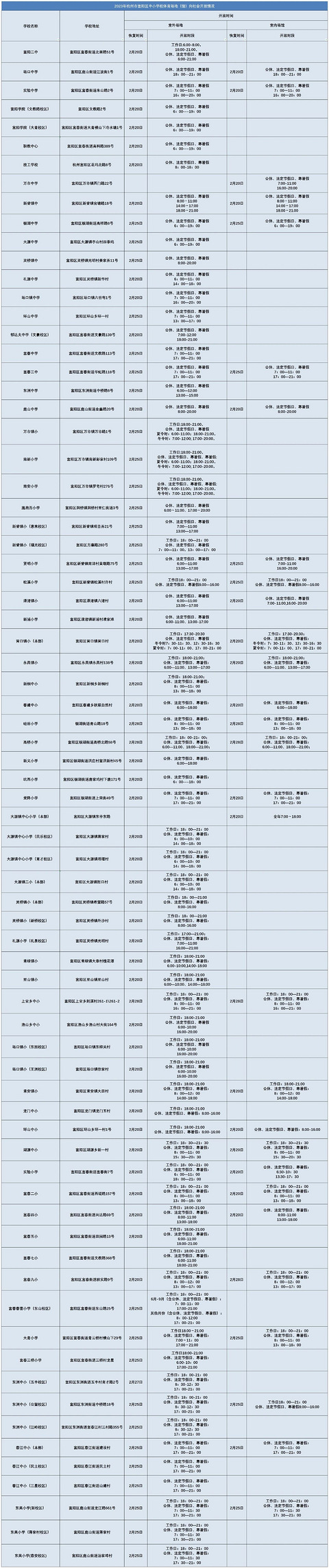 为满足广大市民群众的健身需求,进一步营造浓厚的“全民健身、共享亚运”氛围,打造全民共享体育民生工程,根据上级要求,决定于2023年2月20日起有序恢复富阳区中小学校室外体育场地及具备开放条件的学校室内体育馆向社会开放。本轮共开放74个校区,45个校区仅开放室外体育场,2个校区仅开放室内体育馆,27个校区同时开放室内、室外体育场(馆)。 2023年富阳区学校体育场地(馆) 向社会开放清单 注:因部分