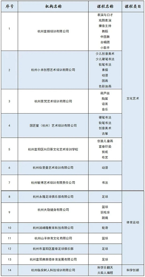 为丰富课后服务内容,拓宽课后服务渠道,根据《富阳区关于遴选非学科类校外培训机构参与学校课后服务工作的公告》通知要求,区“双减”工作专班组织相关部门开展了遴选工作。根据遴选条件和要求,经机构自行申报、主管部门资质审定、学科专家课程、师资审核,现将富阳区第一批非学科类校外培训机构参与学校课后服务“白名单”予以公示(详见下表,顺序不分先后)。 第一批富阳区非学科类 校外培训机构参与学校课后服务“白名单”