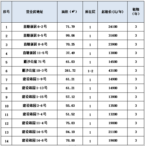 招租公告 兹定于2021年11月23日8:30(开始)在富阳区产权电子交易平台举行营业房租赁权公开招租,现将有关事宜公告如下: 一、租赁物标的位于杭州市富阳区春江街道直塘新居、雁沙公寓、建设锦园四个小区共14间营业用房租赁权(租期3年)。交易项目明细 二、承租条件、业态凡遵守中华人民共和国法律、法规的境内自然人、法人、其他组织均可通过网上系统报名参与竞拍,原承租方享有同等价格优先权。该租赁物系公园